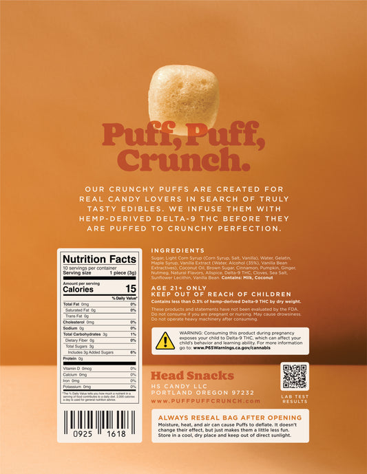 After the initial crunch, our Puffs immediately melt in your mouth, leaving nothing behind but pure flavor. No more pieces getting stuck in your teeth. No more excessive chewing on cheaply made gummies.